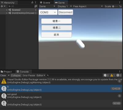 (1)將UI移到一個新場景中,利用DontDestroyOnLoad的功能,讓Unity即使在場景變更中,串列埠的設定介面仍然存在、連線不會中斷。